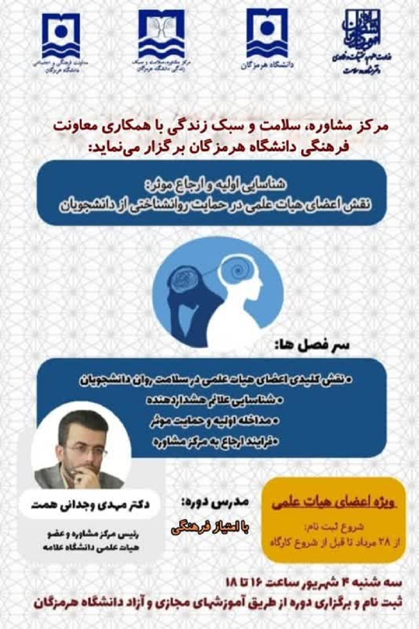 مرکز مشاوره،سلامت و سبک زندگی با همکاری معاونت فرهنگی دانشگاه هرمزگان برگزار می نماید.
